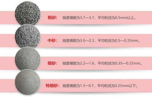 砂的细度模数:混凝土中砂和石材厚度的指标可以表征天然砂粒度的厚度和类别的指数,通过细度模数可以明确砂子的粗细程度。细度模数越大,表示砂越粗.细度模数在3.7-3.1为粗砂,在3.0-2.3为中砂,在2.2-1.6为细砂。